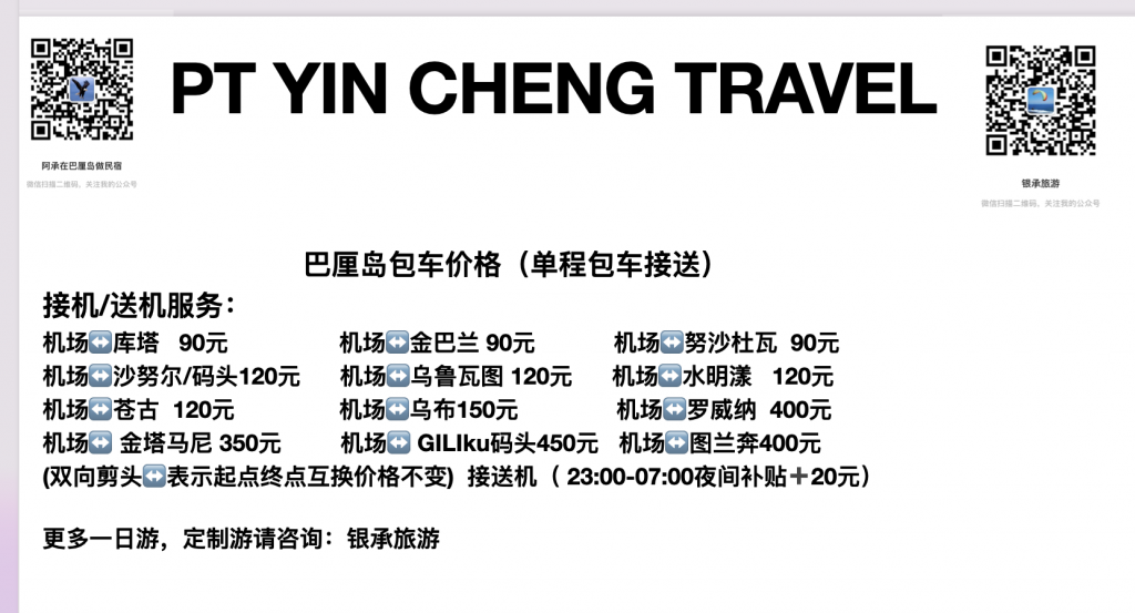 巴厘岛机场接送服务将使您往返图班伍拉·赖国际机场变得轻而易举。当您抵达巴厘岛时,或者当您在巴厘岛度假结束时计划离开酒店时,他们会帮您找到一辆随机出租车或 VIP 车。